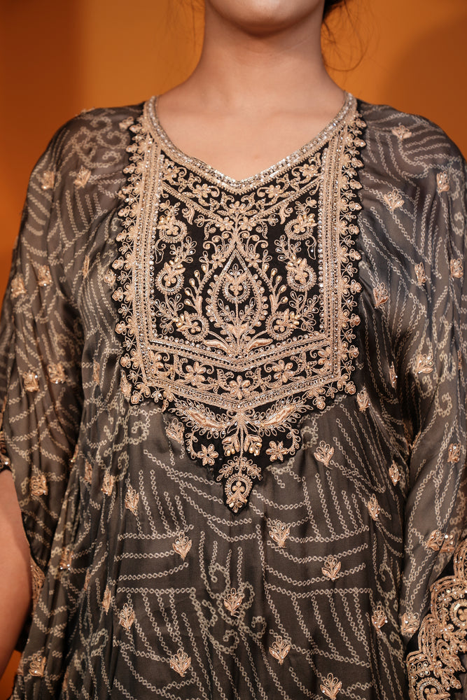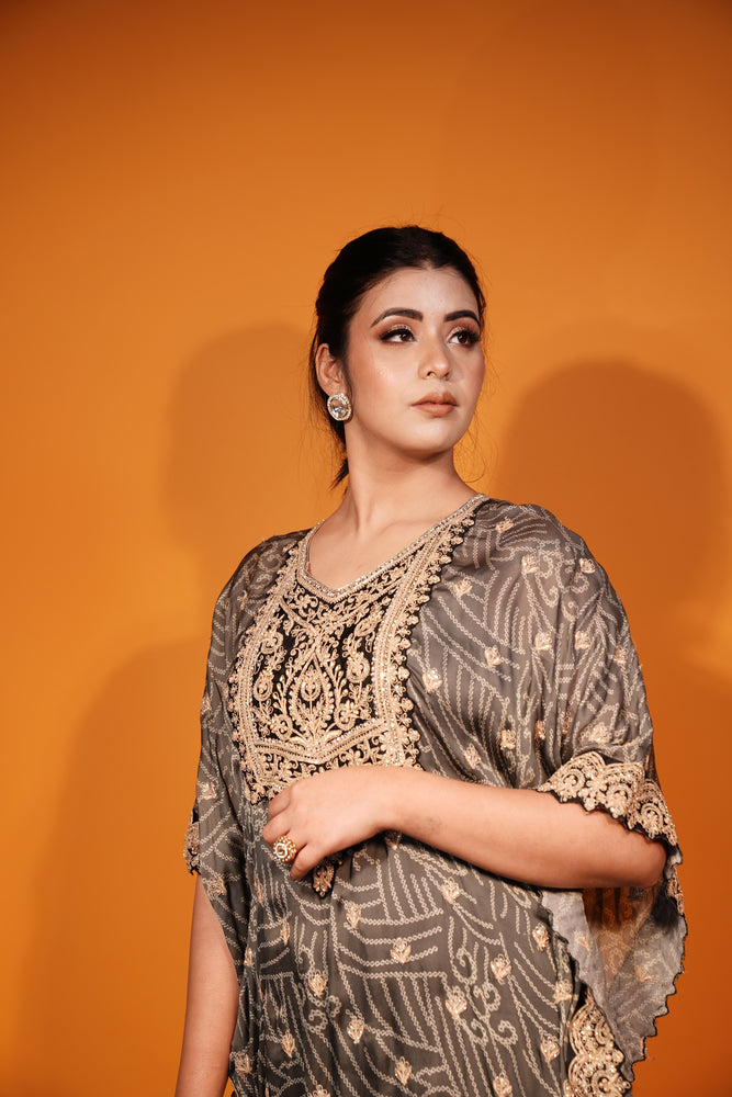 The Kaftan Kurti comes in a beautiful ombre shade of grey to black, giving it a modern and graceful look. It is adorned with detailed dori, bead, sequins, thread, and patch work, adding a touch of sparkle and fine craftsmanship.