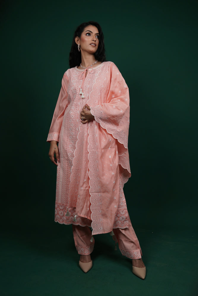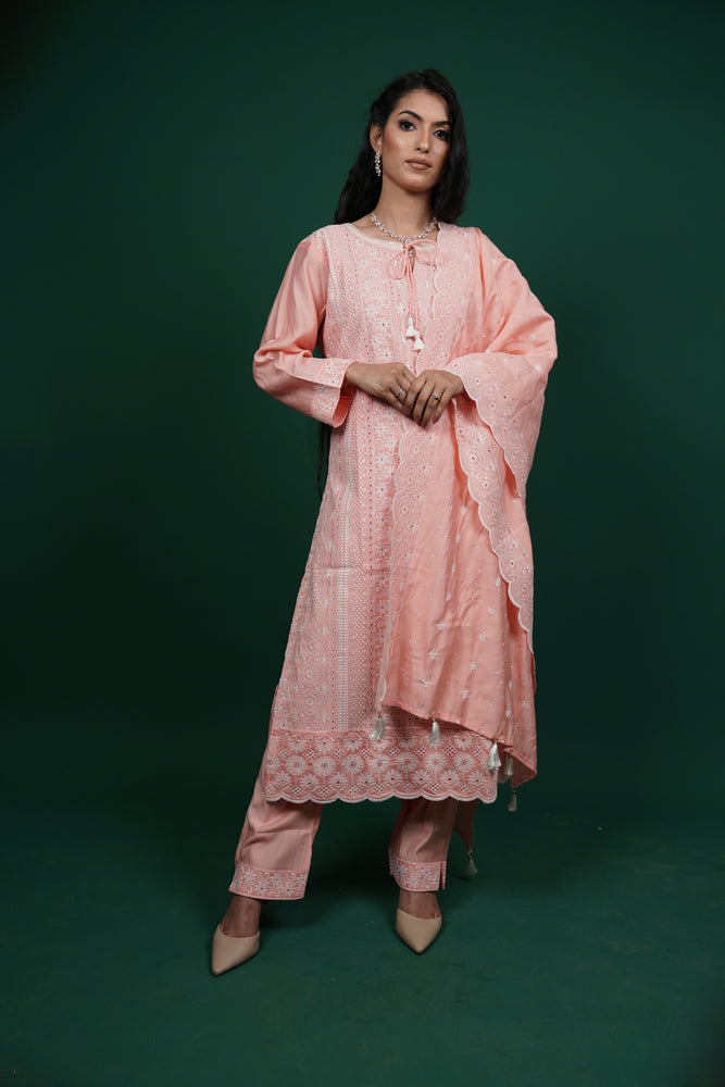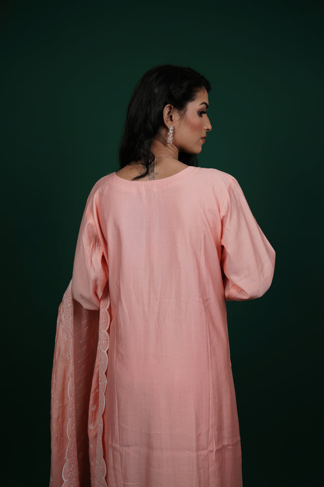 This 3-piece set includes a Kurti, straight pants, and a matching dupatta, all curated in a breathable and comfortable linen blend fabric that drapes beautifully and feels gentle on the skin. The soft peach hue adds a refreshing charm, perfect for day events, festive gatherings, or even semi-formal occasions.