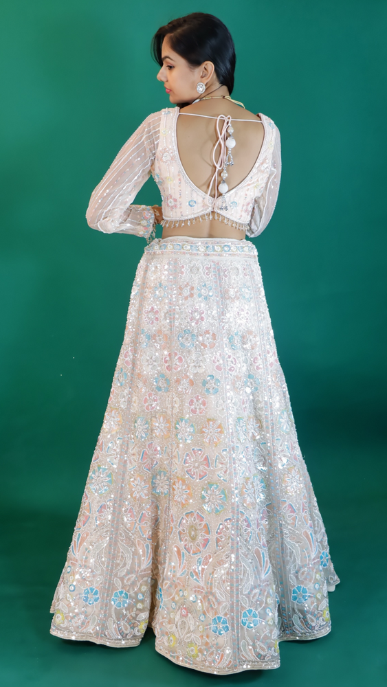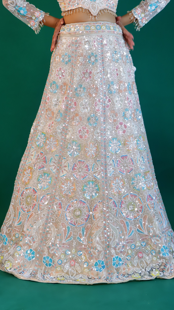 Step into elegance with this stunning Peach Pink Net Lehenga, designed for the modern bride and festive celebrations. Crafted from premium net fabric, this ensemble is adorned with intricate sequins, nag, beads, and pearl work, giving it a rich and graceful appeal. The delicate embellishments sparkle beautifully, adding a touch of glamour while keeping the look sophisticated. Perfect for weddings, receptions, and grand occasions, this lehenga is a timeless blend of tradition and contemporary style.