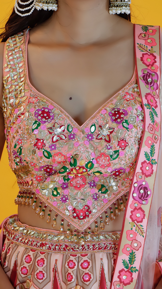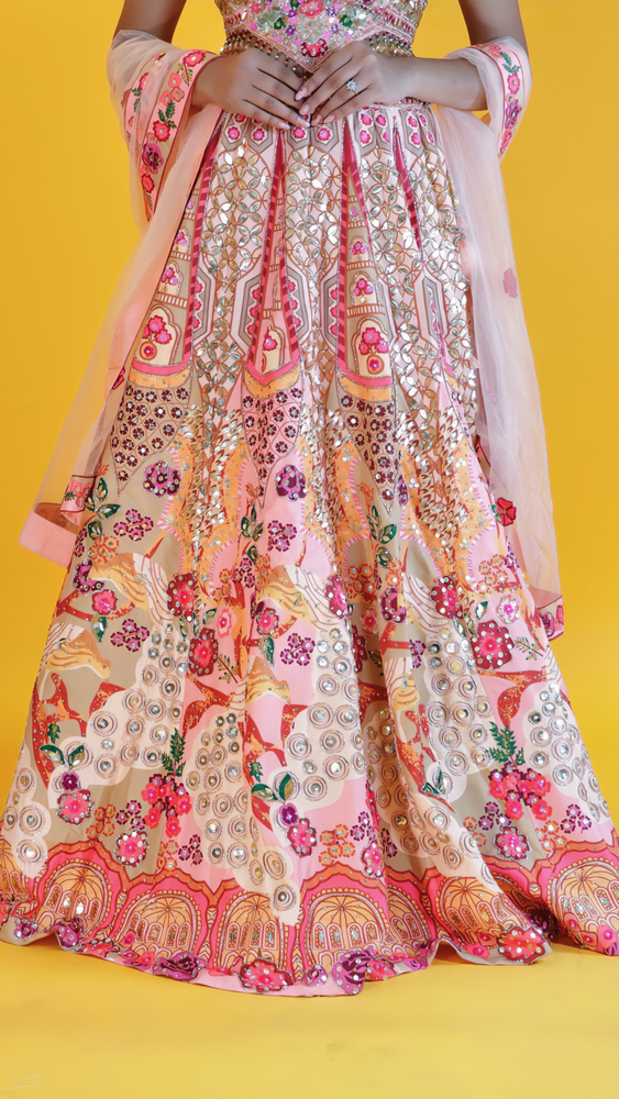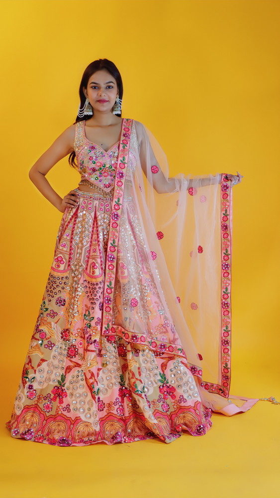 Radiate elegance with our Peach Pink Raw Silk Lehenga, a timeless ensemble crafted for the modern yet traditional bride. The luxurious raw silk fabric is adorned with intricate zari and thread embroidery, highlighted by dazzling metallic mirror accents that add a regal sparkle. The delicate peach pink hue enhances its charm, making it perfect for weddings, festive occasions, and grand celebrations.
