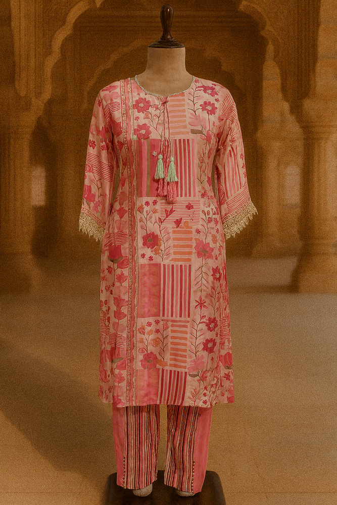 Step into effortless elegance with this Pink Crepe Floral Print Co-ord Set. Designed in a soft and breathable crepe fabric, this set features an all-over floral print that adds a touch of charm and freshness to your look. Perfect for casual outings, brunches, or festive gatherings, the co-ord set combines comfort with chic style, making it a versatile must-have for your wardrobe. Pair it with minimal jewelry and sandals for a complete look.