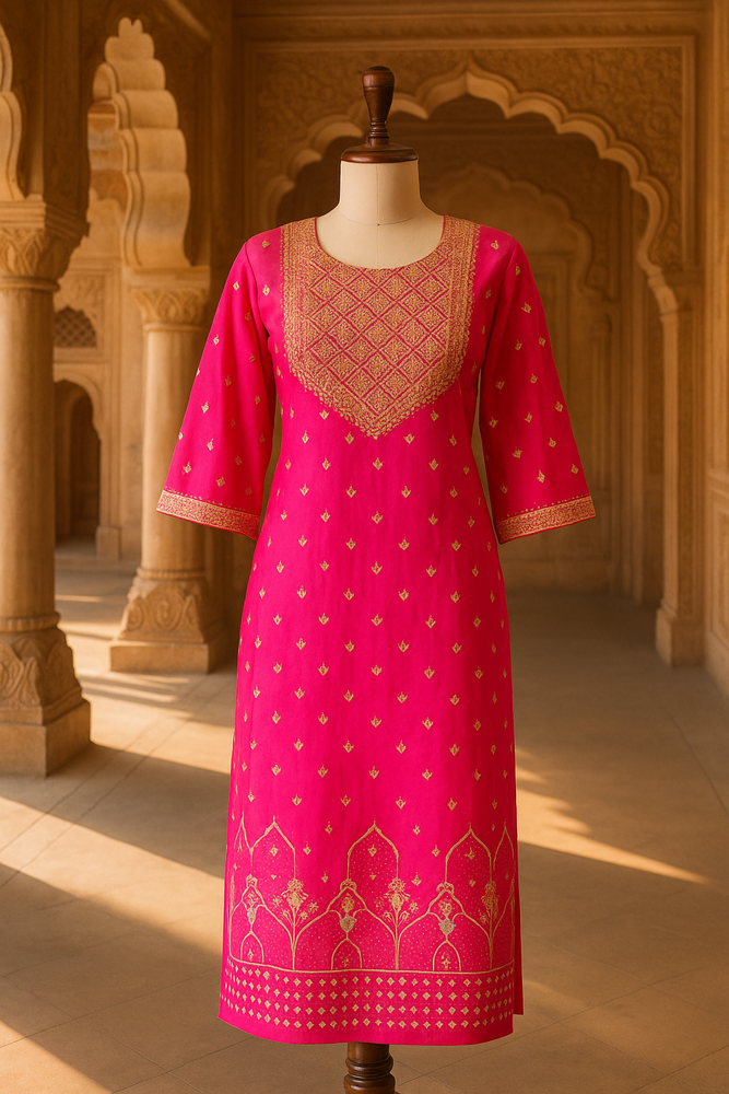 Elevate your everyday ethnic wardrobe with this elegant Pink Cotton Kurti, adorned with delicate Zari work. Crafted from soft, breathable cotton, it ensures all-day comfort while exuding timeless charm. The intricate Zari detailing adds a touch of sophistication, making it perfect for casual outings, festive gatherings, or semi-formal occasions. Pair it with your favorite leggings, palazzos, or skirt for a graceful, effortlessly stylish look.