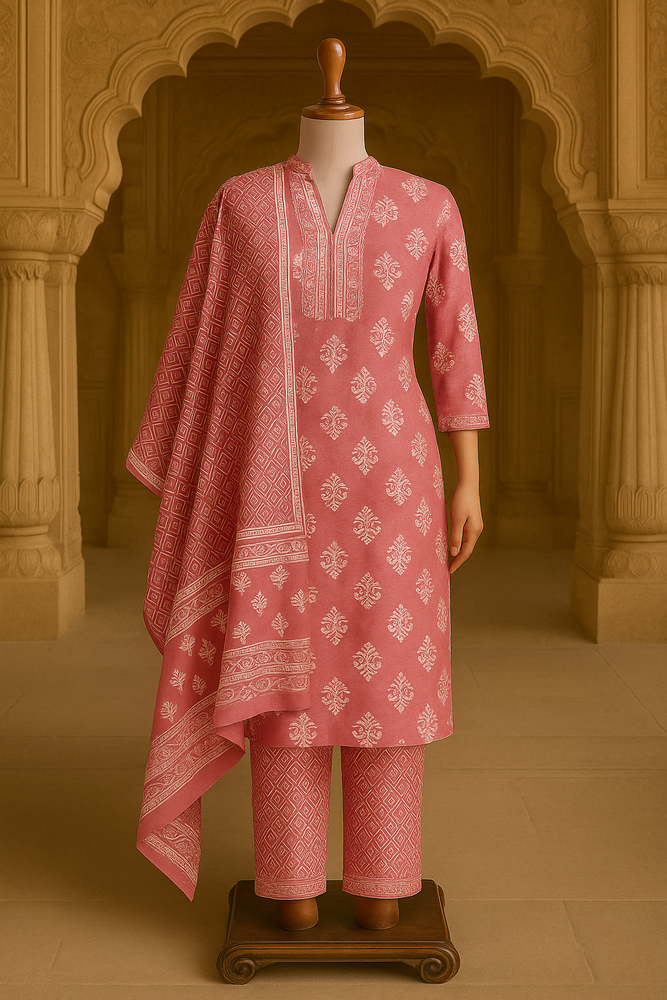 Pink Printed Cotton Suit Set with Matching Dupatta