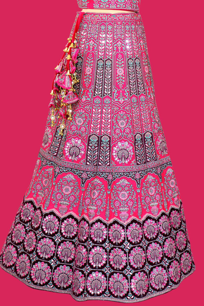 Step into your fairytale moment with this exquisite pink bridal lehenga crafted from premium micro velvet. Designed to dazzle, this ensemble features intricate thread embroidery, radiant mirror work, delicate nag detailing, and luxurious zari craftsmanship. The rich texture of velvet adds a royal charm, while the detailed handwork reflects timeless tradition and modern elegance.