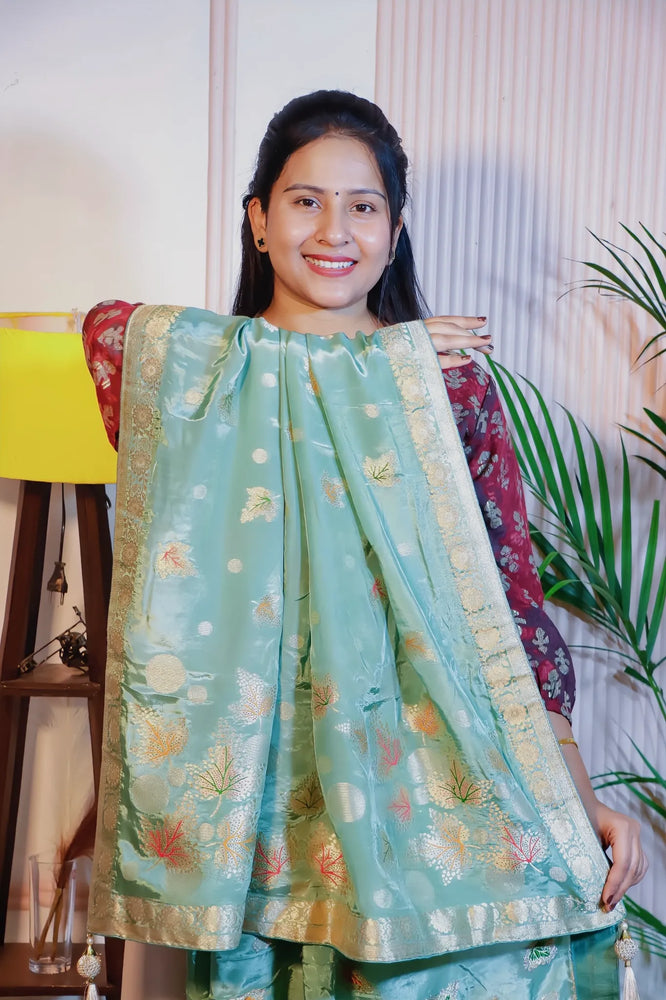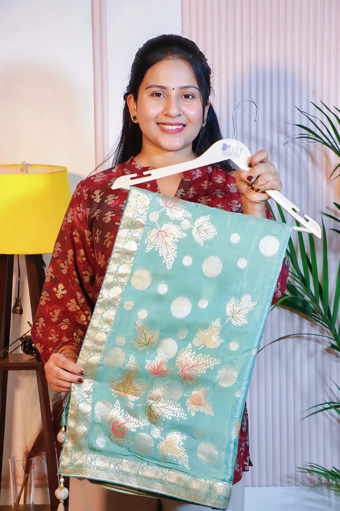 Elevate your ethnic wardrobe with this elegant Pista Green Silk Saree, crafted to add charm and sophistication to your special moments. Made from premium silk, it offers a smooth, luxurious drape that feels as beautiful as it looks. The saree is adorned with intricate machine work all over, giving it a refined finish and subtle shimmer.