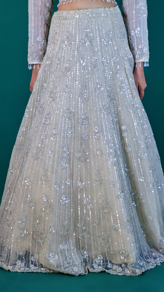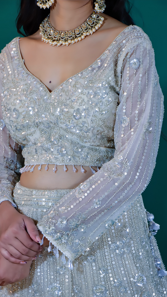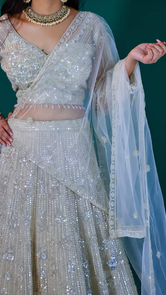 Step into elegance with this stunning Powder Blue Lehenga, crafted in delicate net fabric. The ensemble is beautifully adorned with intricate Zari embroidery, shimmering sequins, and graceful pearl embellishments, making it a perfect choice for weddings, receptions, or festive occasions. Its dreamy powder blue hue adds a soft and regal charm, while the detailed craftsmanship ensures a luxurious look. Pair it with statement jewelry to complete your ethereal style.