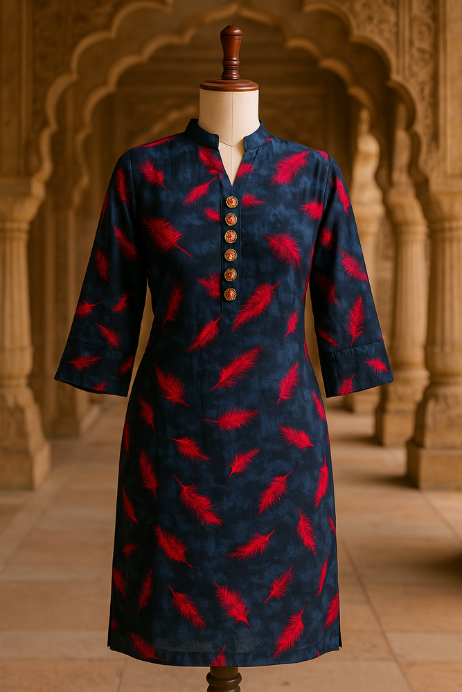 Add a touch of elegance to your everyday style with this beautifully designed kurti. Crafted from soft and breathable cotton fabric, this kurti ensures all-day comfort while keeping you effortlessly stylish. Featuring an all-over feather print in striking pink against a rich navy blue base, it blends contemporary charm with timeless appeal.