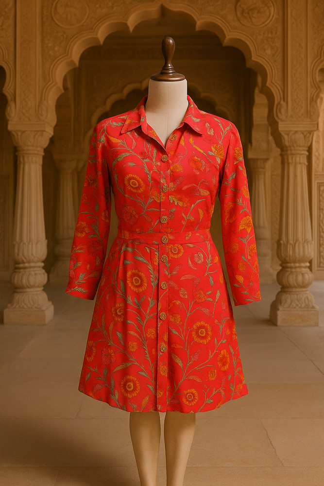 Make a bold and beautiful statement with our Red Cotton Midi Dress, featuring an all-over floral print that radiates charm and elegance. Crafted from soft and breathable cotton fabric, this dress offers all-day comfort while keeping your look effortlessly stylish. The flattering midi length and flowy fit make it perfect for casual gatherings, brunch dates, or day outings. Style it with minimal accessories and sandals for a chic, relaxed look.