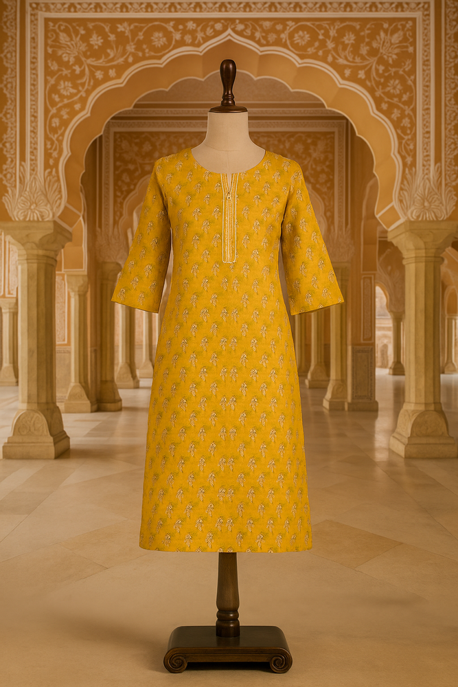 Elevate your everyday style with this charming mustard yellow kurti crafted in soft, breathable cotton. Designed for comfort and effortless elegance, it features an all-over floral print that adds a touch of feminine grace to your wardrobe. Perfect for casual outings, workwear, or festive gatherings, this kurti pairs beautifully with leggings, palazzos, or jeans. Experience the perfect blend of style and comfort with this must-have addition to your ethnic collection.