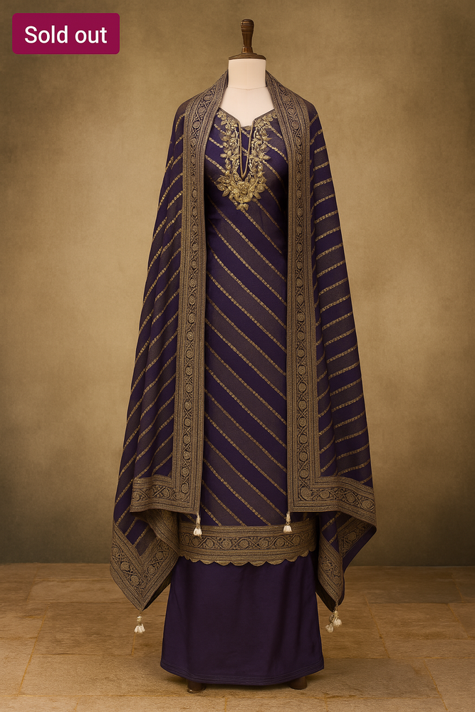 Intricately adorned with delicate Pearl, Zari, and Cutdana work in a striking Purple hue, this suit radiates timeless charm and sophistication. The shimmering embellishments add depth and glamour, making it a perfect choice for festive occasions, weddings, or evening gatherings.