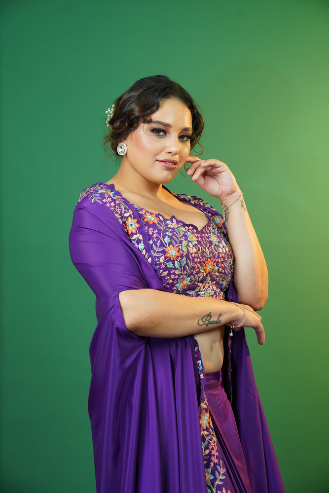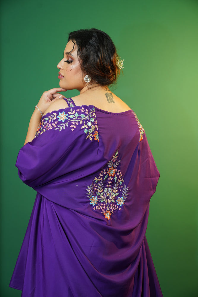 Then the perfect Purple dhoti set by Daisy Fashion is here. The embellished Crop top with thread floral work and sequins on the crop top blouse and a silk look dhoti style skirt accompanied by a stylish cape completes the look.