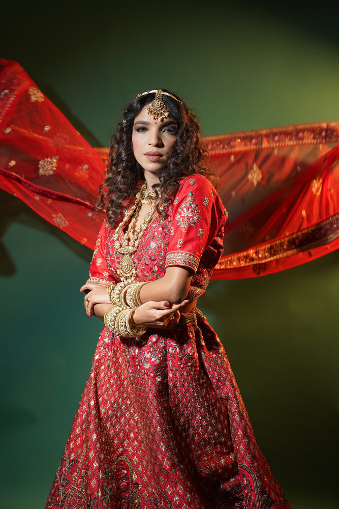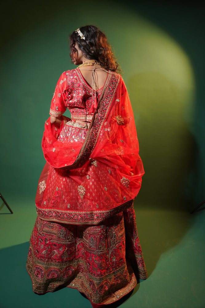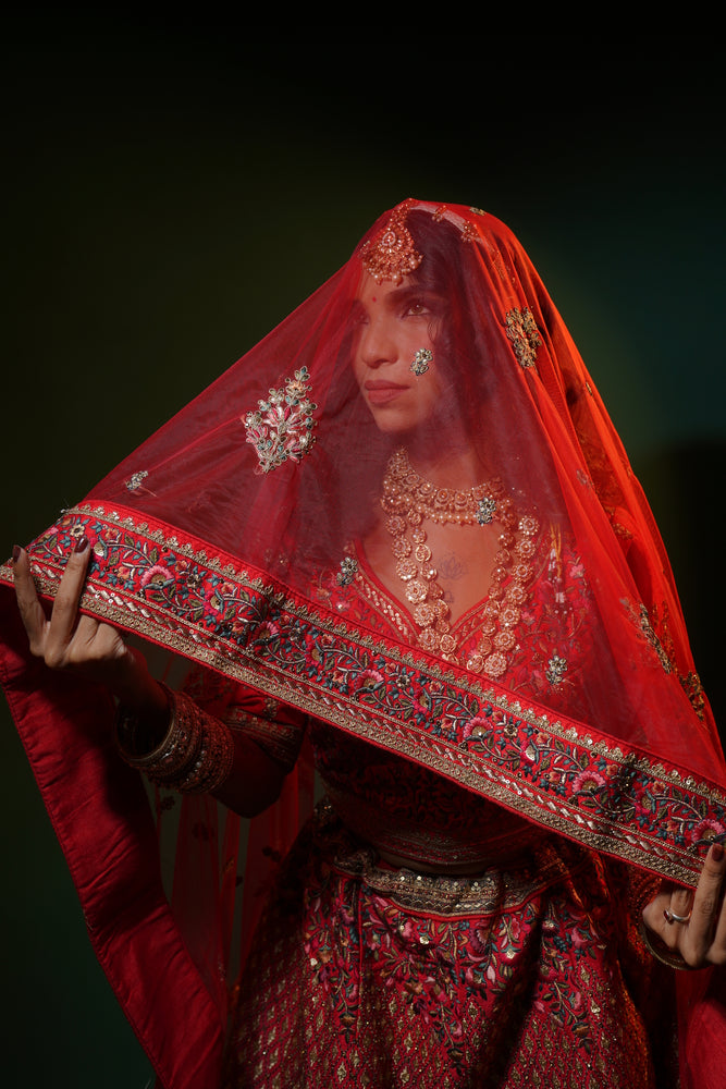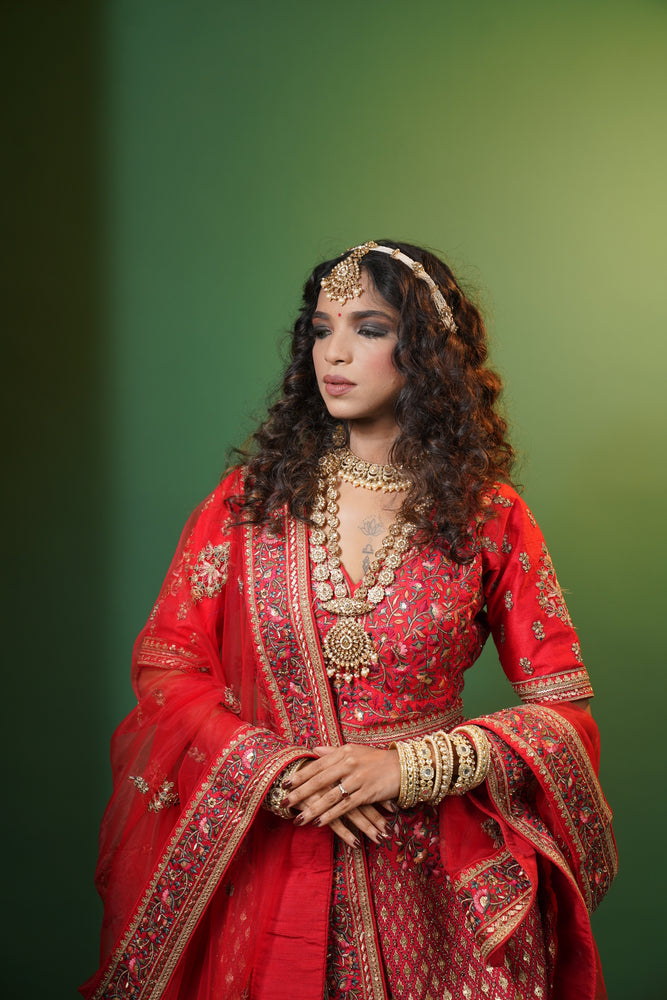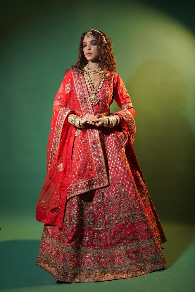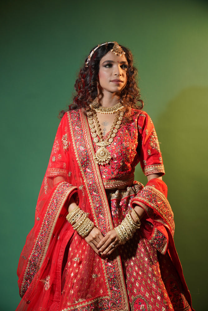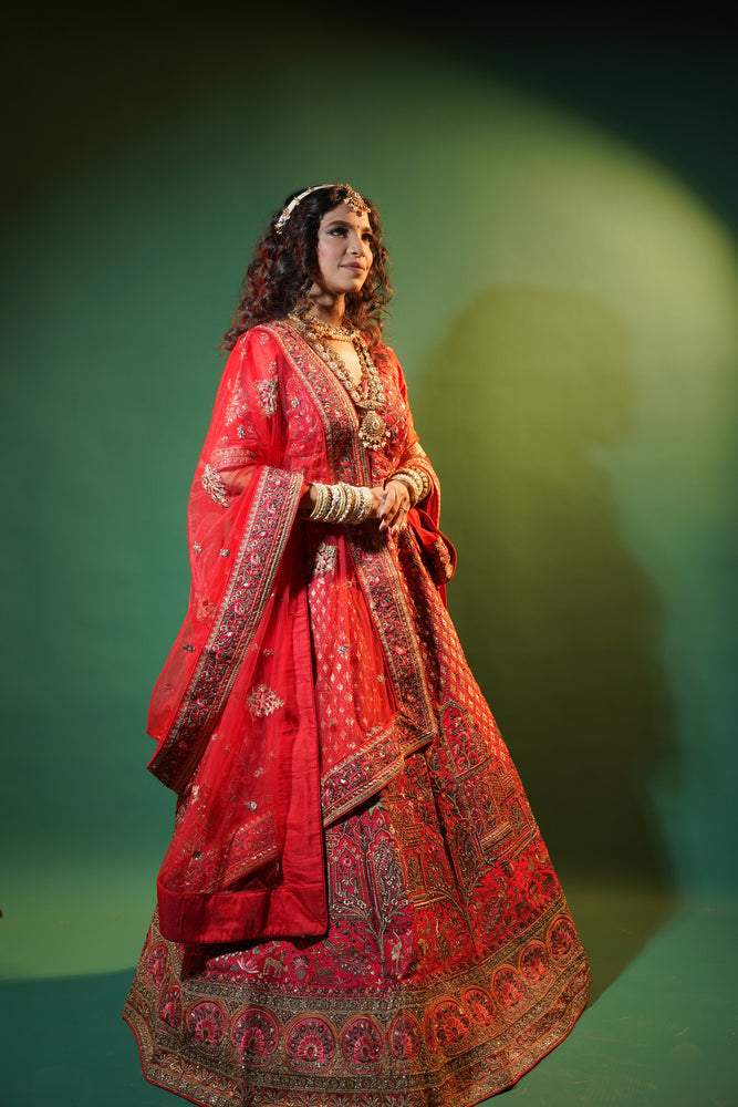 Make your special day unforgettable with this stunning red bridal lehenga. Crafted from luxurious raw silk, the lehenga and blouse feature intricate all-over embroidery with thread, zari, sequins, dori, and nag work—bringing traditional craftsmanship to life.