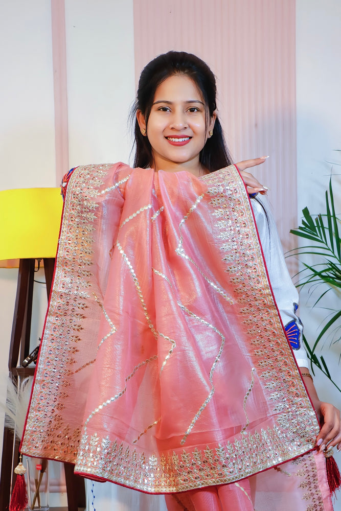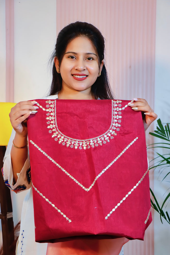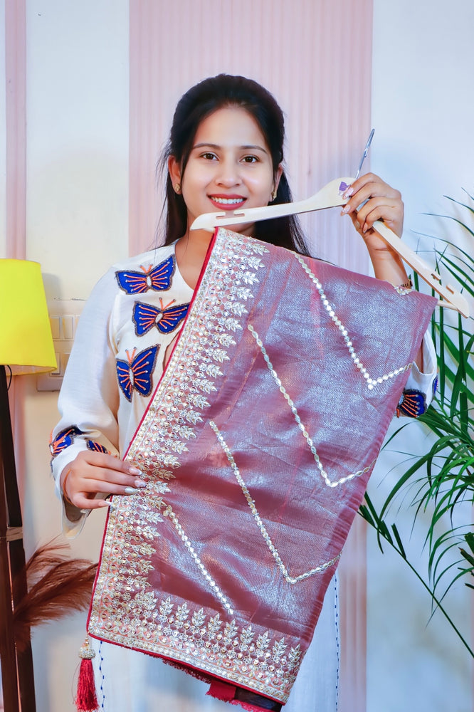 Drape yourself in timeless elegance with this Royal Blue Matte Shimmer Saree, adorned with exquisite Gotapatti, Nag, Sequins, Dori, and Thread work. The subtle shimmer of the fabric beautifully complements the intricate detailing, adding a regal charm to your look.