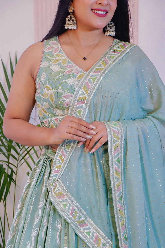 Grace your special occasions with this stunning Sea Green Lehenga crafted from luxurious Chinnon Silk. Adorned with intricate thread embroidery, this ensemble beautifully blends elegance with contemporary charm. The soft, flowy texture of Chinnon Silk adds a graceful drape, making it a perfect pick for festive celebrations, weddings, or sangeet nights. Pair it with statement jewelry to complete your ethereal look.