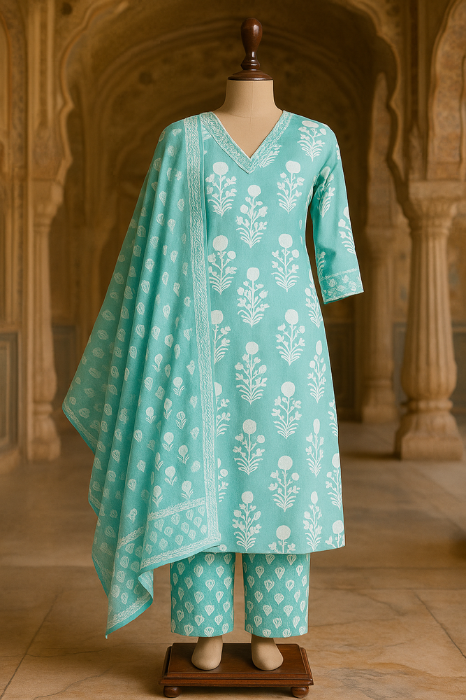 size guide of Sea Green Floral Block Print Cotton Suit Set
