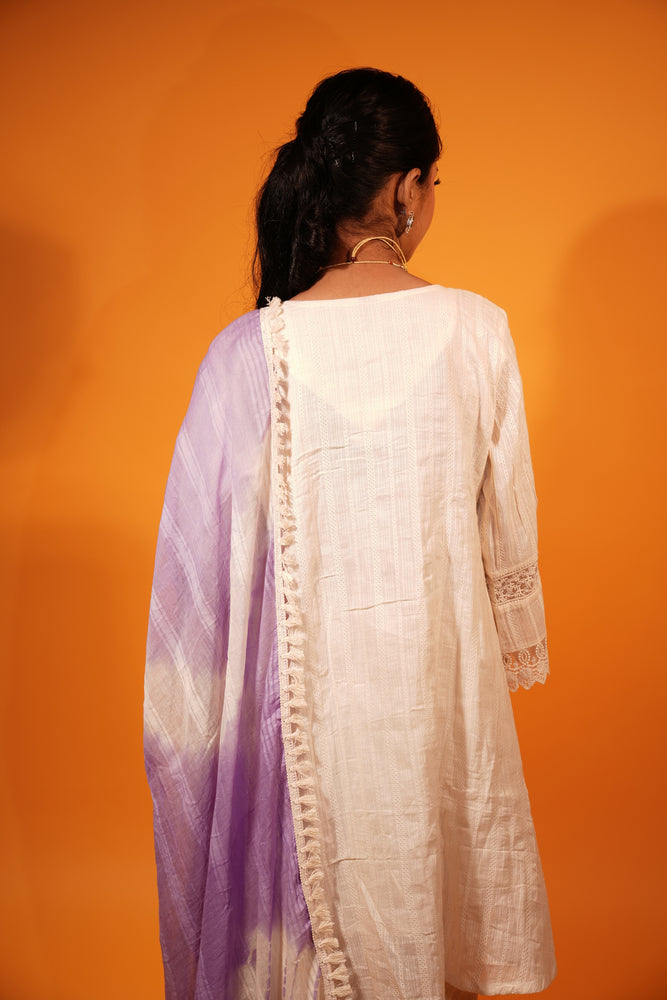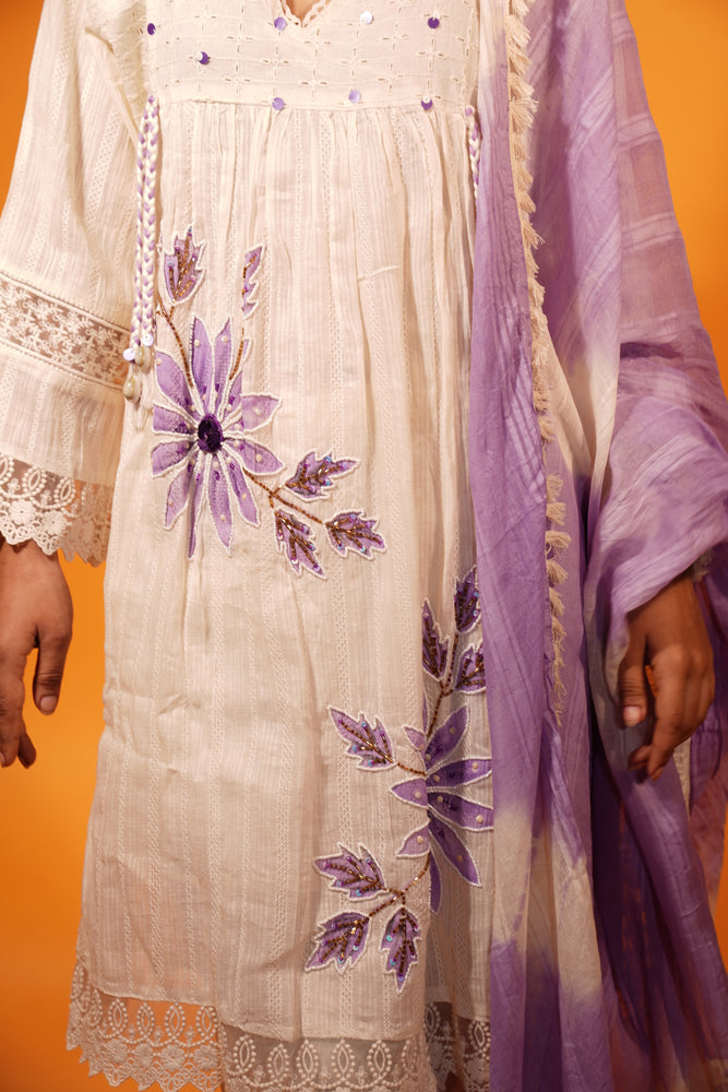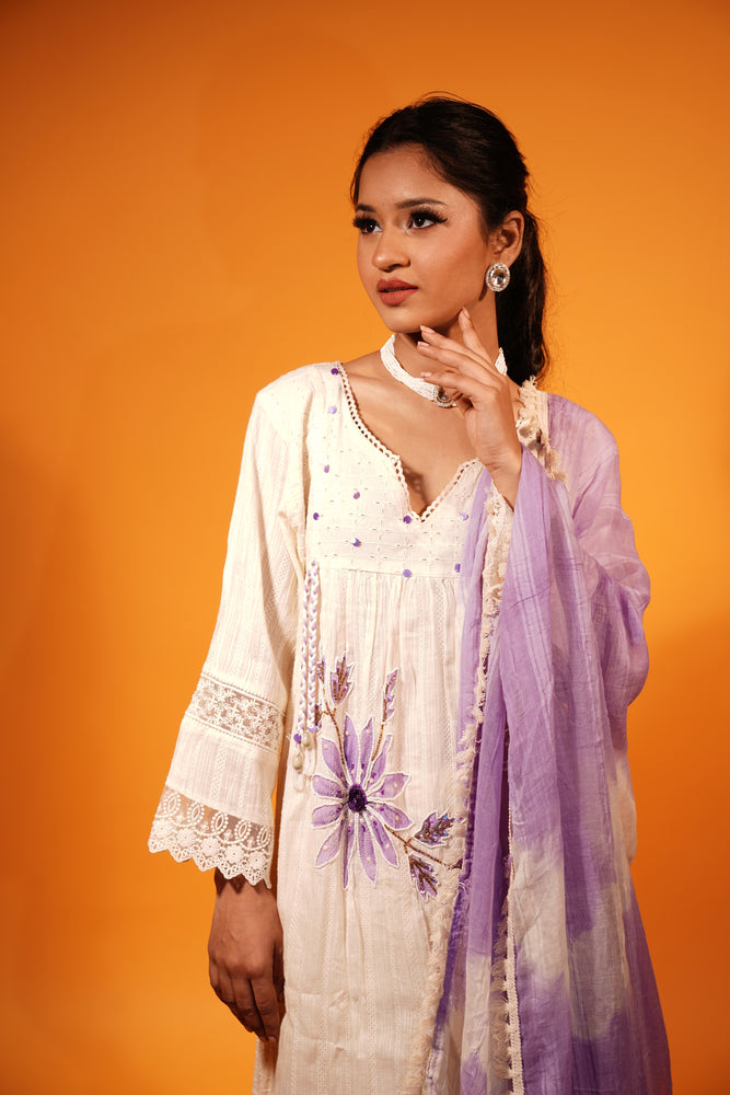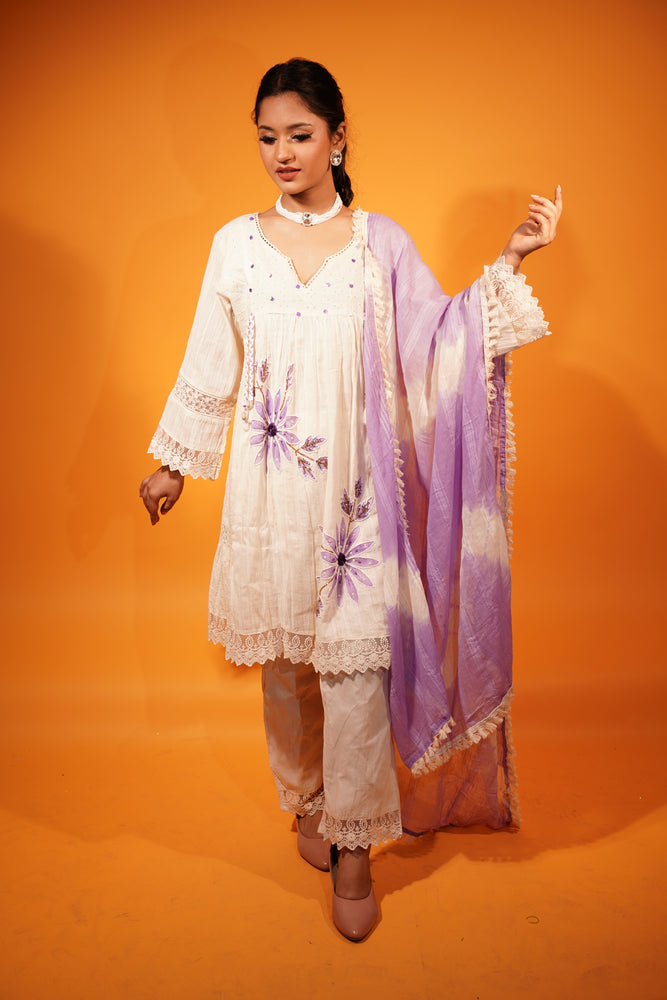 This Short Frock Style Kurti Set in soft cotton fabric is perfect for summer style. It's beautiful Chikankari, bead, sequins, nag, and cutdana work with a lovely purple floral print. Perfect for casual outings or small gatherings, it blends elegance with everyday ease.