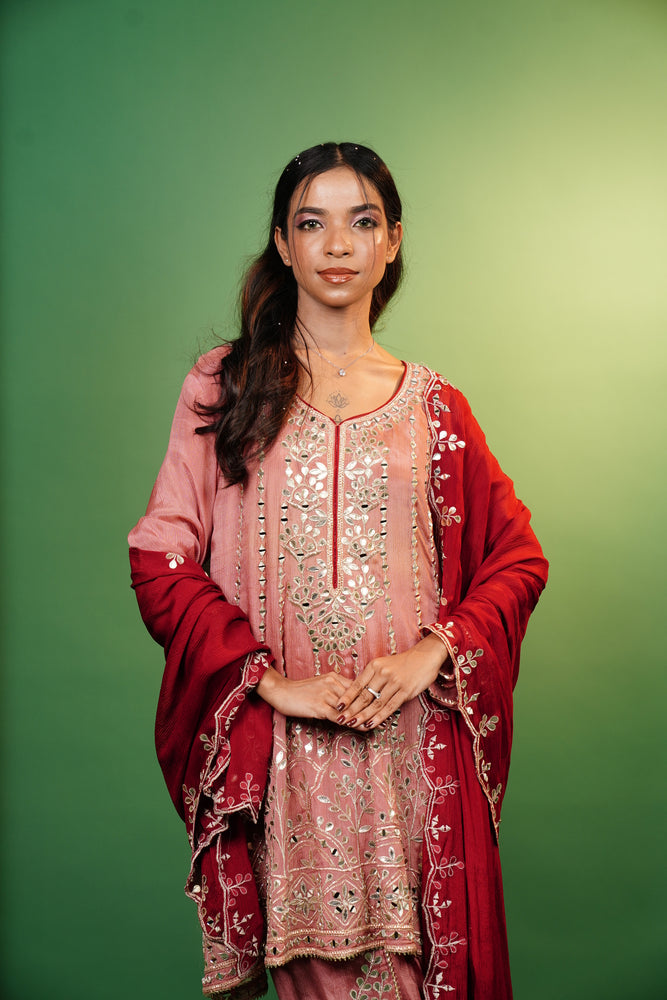 Matched beauty and trend in this stylish Peach Short Kurti and Tulip Pant crafted in lightweight chiffon fabric. Adorned with delicate gotta patti work, the outfit exudes traditional charm with a modern twist. The rich Maroon Dupatta adds a bold contrast, making it perfect for festive occasions or intimate gatherings. Comfortable and effortlessly