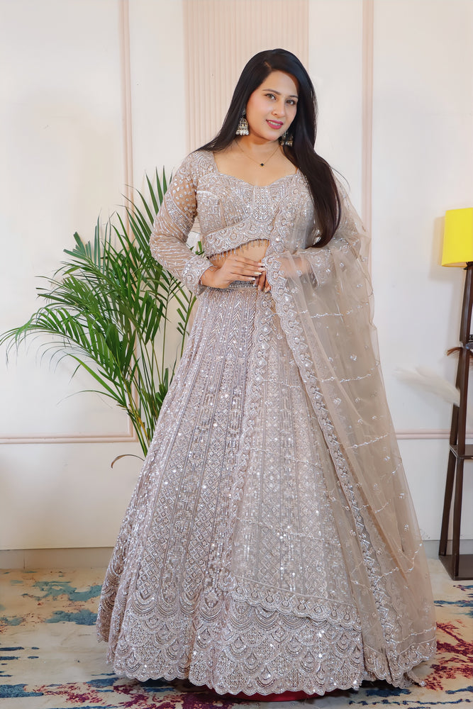 Step into timeless elegance with our Silver Grey Net Embroidered Lehenga, designed to make you dazzle at every occasion. Crafted from premium net fabric, this lehenga features exquisite Sequins, Thread Embroidery, and Zari work, adding a perfect blend of shimmer and sophistication. The intricate detailing enhances its luxurious appeal, while the soft silver grey hue gives it a graceful and modern charm. Ideal for weddings, receptions, or festive celebrations — this lehenga is a stunning choice for anyone who loves a subtle yet glamorous look.