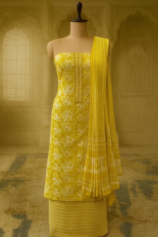 Brighten up your wardrobe with this radiant yellow unstitched cotton suit, designed to bring freshness and charm to your festive look. The breathable cotton base ensures all-day comfort, while delicate gota lace and shimmering artificial mirror work add a touch of traditional glamour. Perfect for daytime celebrations or casual festive wear, this vibrant piece is ready to be stitched into your signature style.