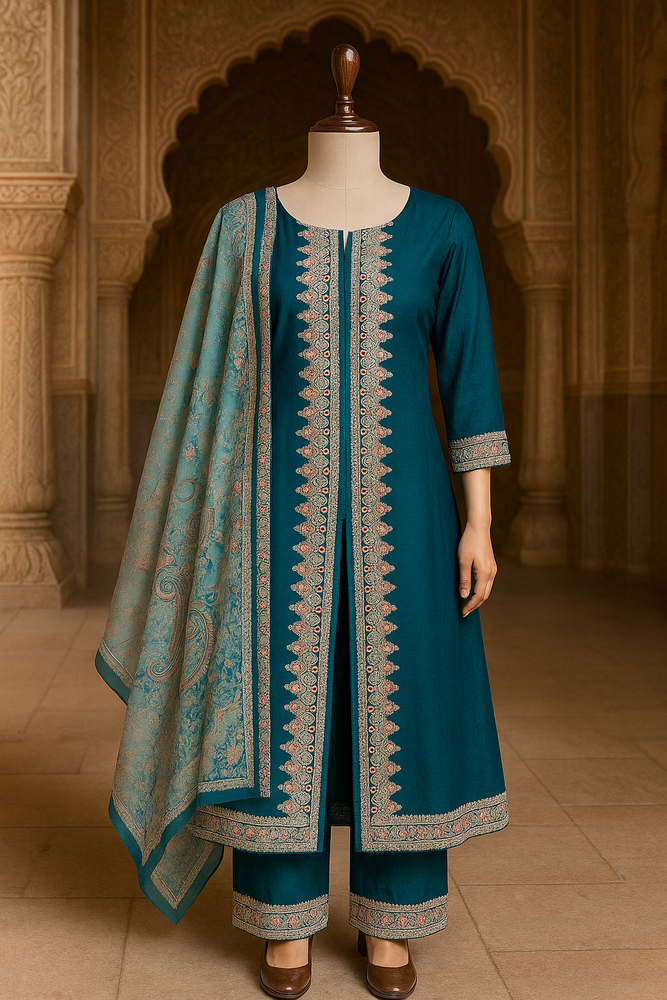 Teal Blue Embroidered Front Cut Open Suit set