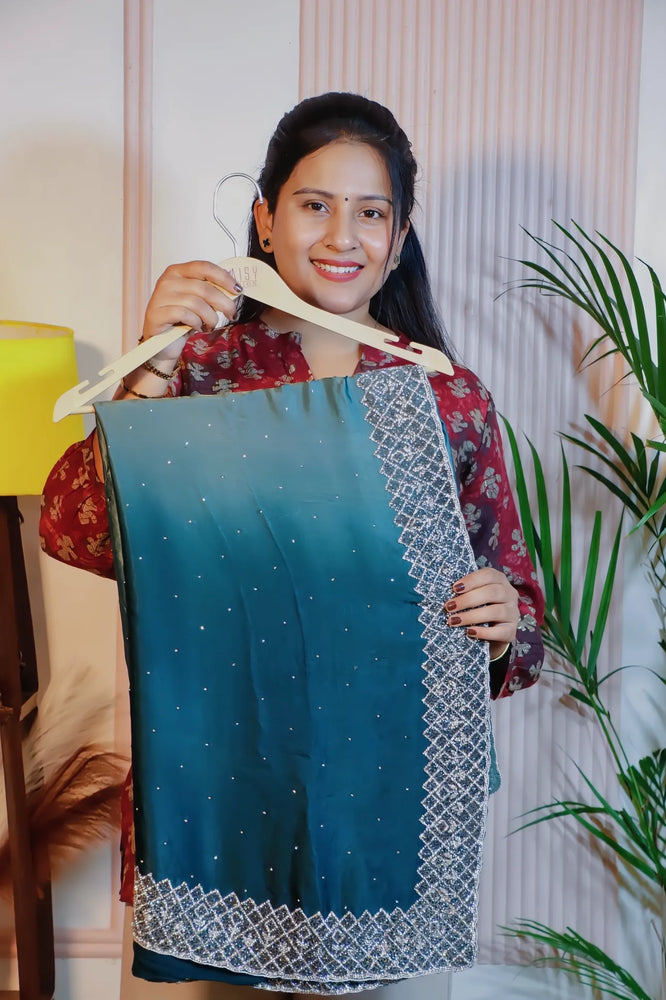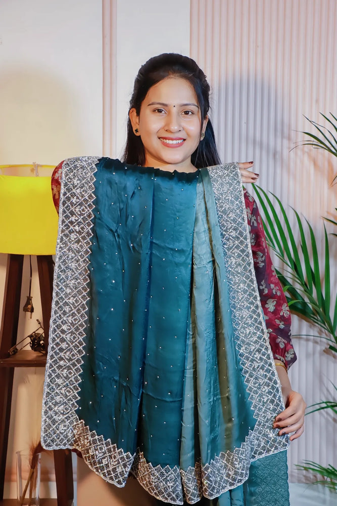 Elevate your elegance with this stunning Teal Blue Satin Saree, crafted to bring a luxurious shine to your festive and special occasions. The smooth satin fabric drapes beautifully, offering a rich and graceful silhouette. Adorned with intricate all-over Nag work, this saree adds a touch of traditional charm blended with modern sophistication.