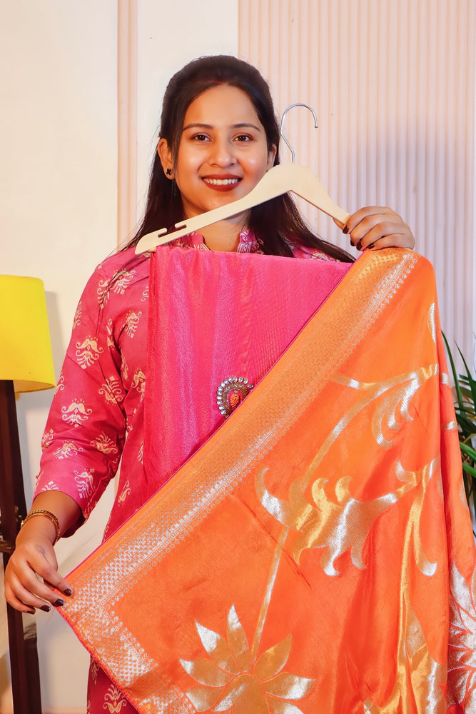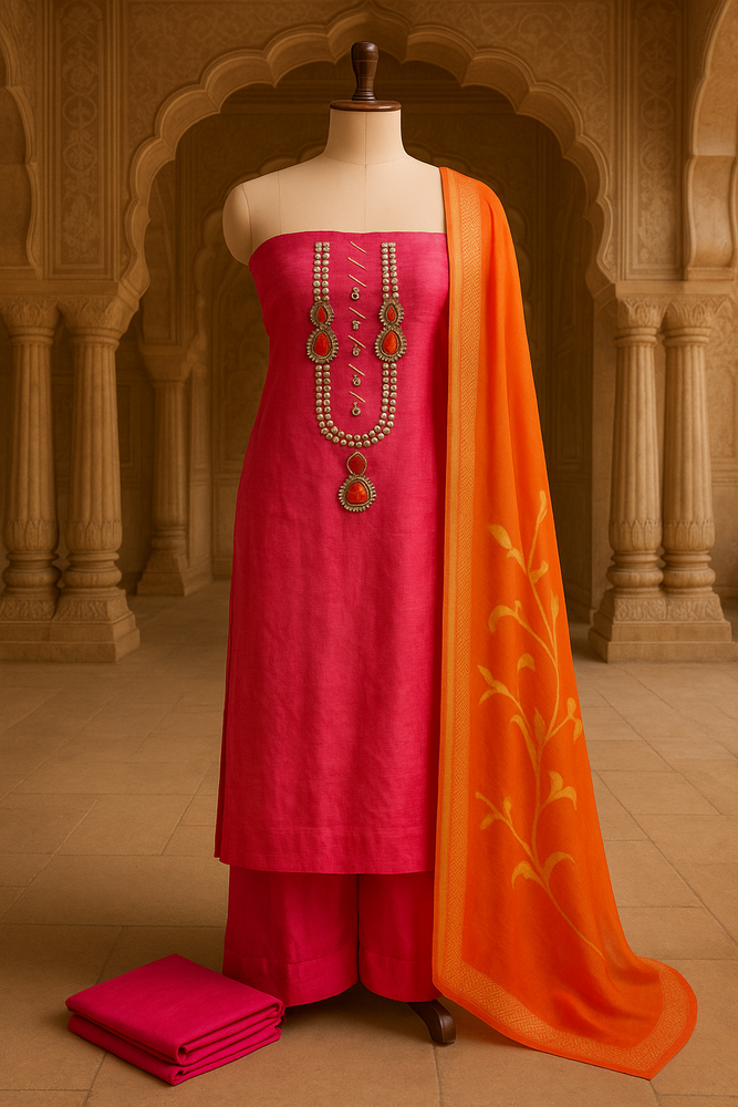 Step into elegance with this pink unstitched suit beautifully embellished with delicate kundan work. The soft pink hue adds a touch of grace and femininity, while the shimmering kundan detailing brings a regal charm that makes it perfect for festive celebrations and weddings.