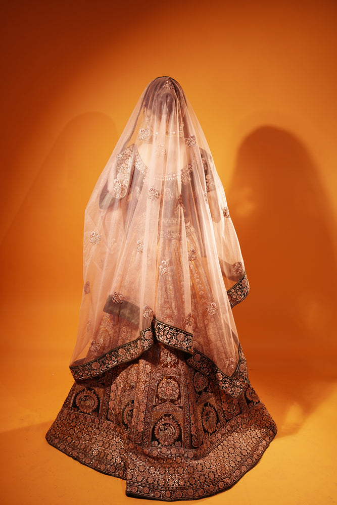 The Lehenga Crafted with luxurious velvet fabric, intricate thread embroidery, sequins, stone and zari work is a true reflection of etheral beauty. Paired with pink net dupatta for a regal touch and fine floral embroideries on blouse are breathtaking.