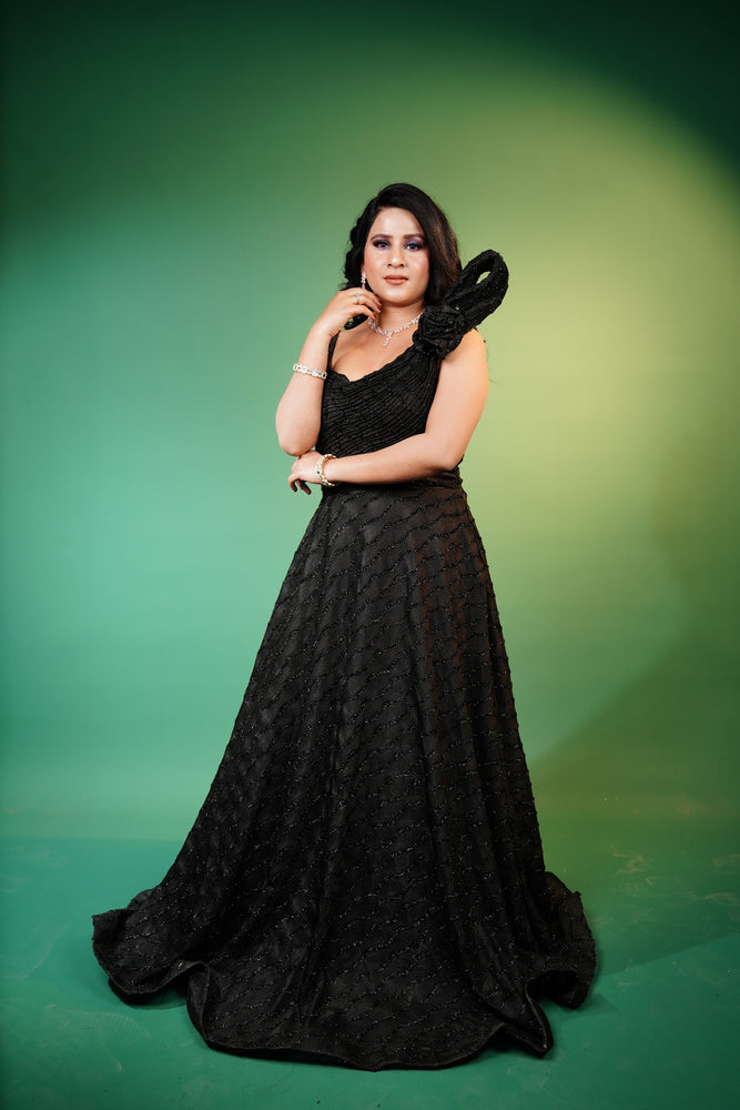 Turn heads with this elegant Black Gown crafted from a soft and stretchy Viscose Rayon and Elastane blend fabric that hugs your silhoulette perfectly. The gown features a chic wavy striped design woven with metallic thread, adding a touch of shimmer and sophistication. Its comfortable fit and stylish pattern make it perfect for evening parties, receptions, or special occasions. A must-have piece for a sleek and modern look.