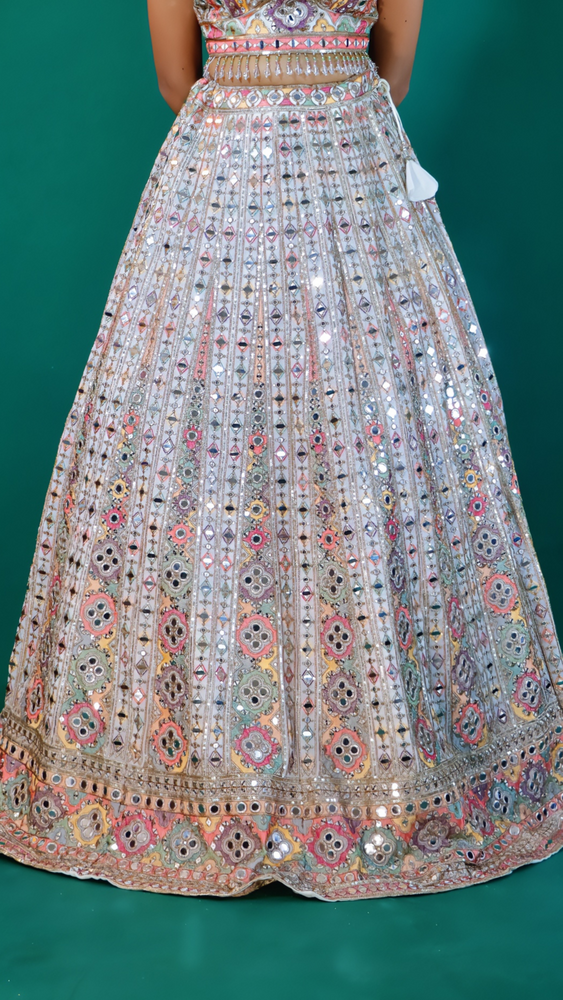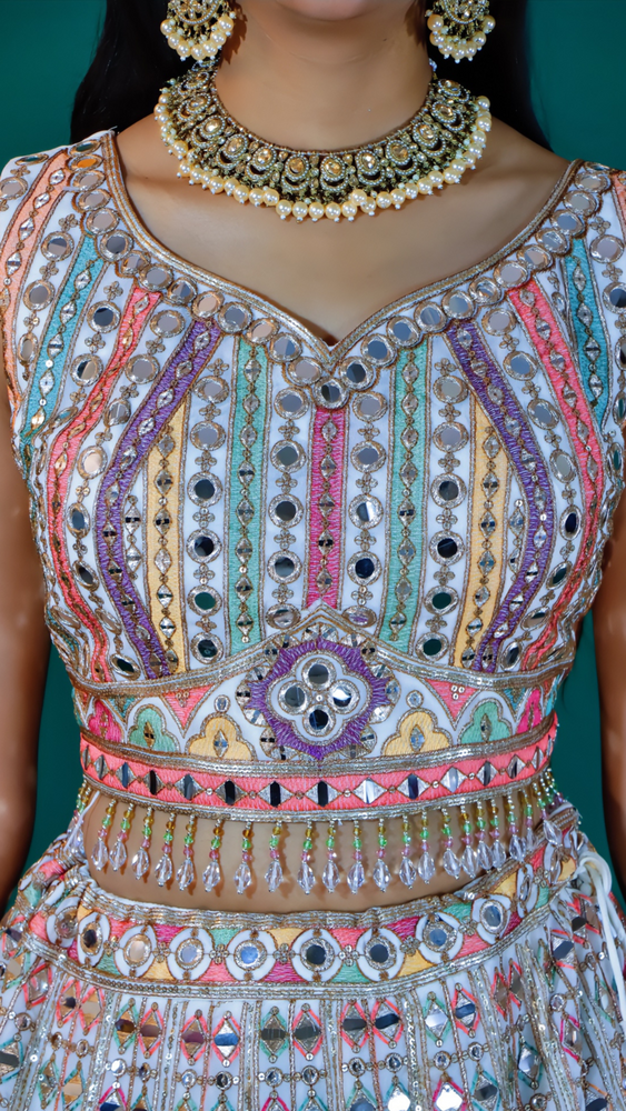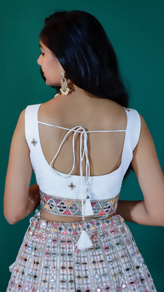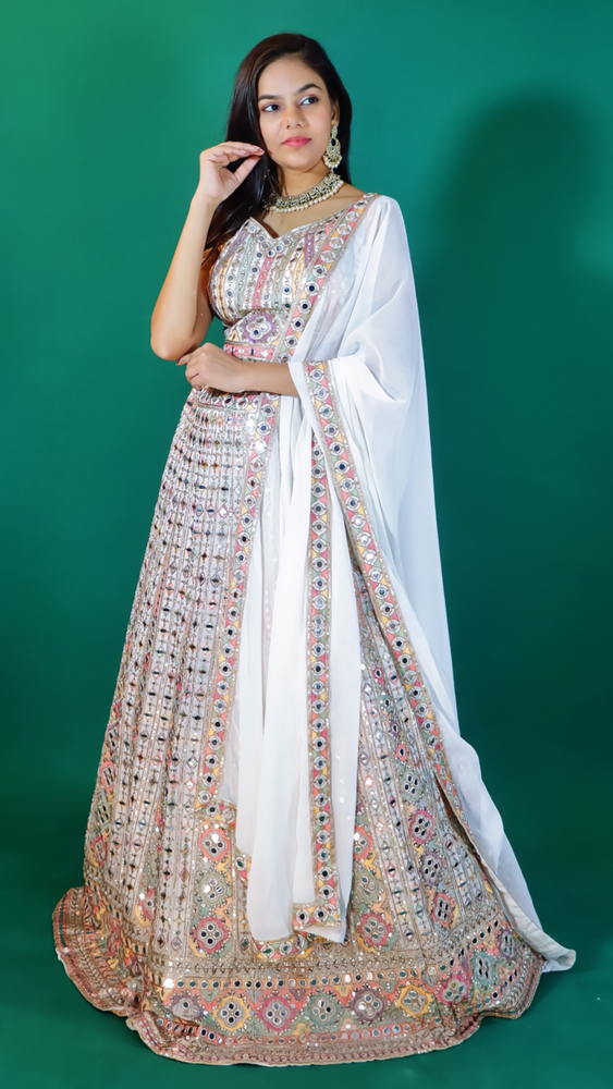 Step into timeless elegance with this stunning White Georgette Lehenga, crafted to perfection for weddings and festive celebrations. Designed in lightweight georgette, the lehenga drapes gracefully while ensuring comfort throughout the day. The intricate Gota Patti detailing, Metallic Mirror embellishments, and delicate Pearl work create a royal blend of tradition and glamour.