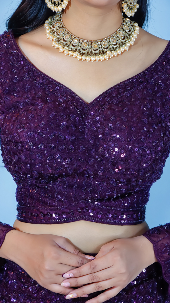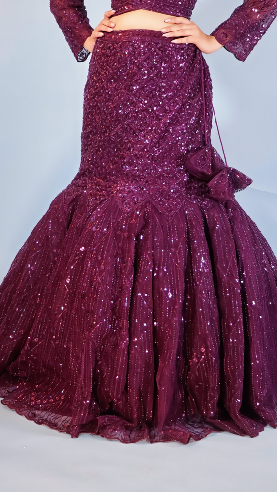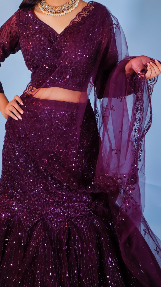 Step into elegance with this stunning Fish Cut Style Lehenga crafted in premium net fabric. Designed in a rich wine shade, this lehenga is adorned with all-over sequins work, adding a perfect blend of sparkle and sophistication. The flattering fish-cut silhouette enhances your curves, making it an ideal choice for receptions, cocktail nights, and grand celebrations. Pair it with statement jewelry to complete the glamorous look.
