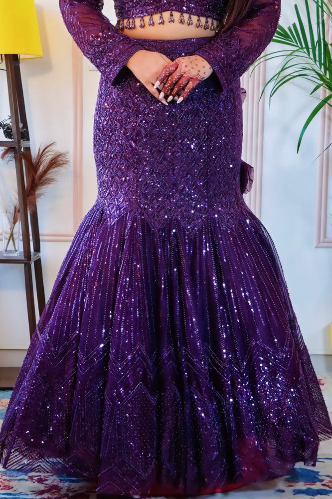 Dazzle in timeless elegance with this Wine Net Fish Cut Lehenga, beautifully designed to accentuate your curves with its graceful silhouette. Crafted in premium net fabric, this lehenga showcases all-over thread embroidery and intricate sequins work, adding a luxurious shimmer to your festive or bridal look. The deep maroon hue enhances its regal charm, making it a perfect choice for weddings, receptions, or grand celebrations. Pair it with statement jewelry to complete your enchanting ensemble.
