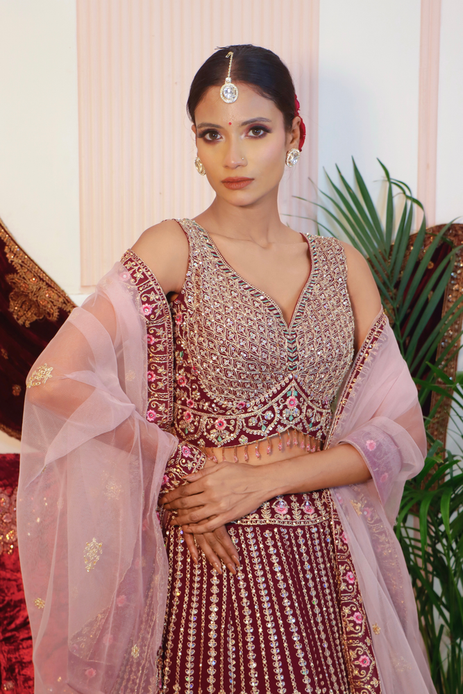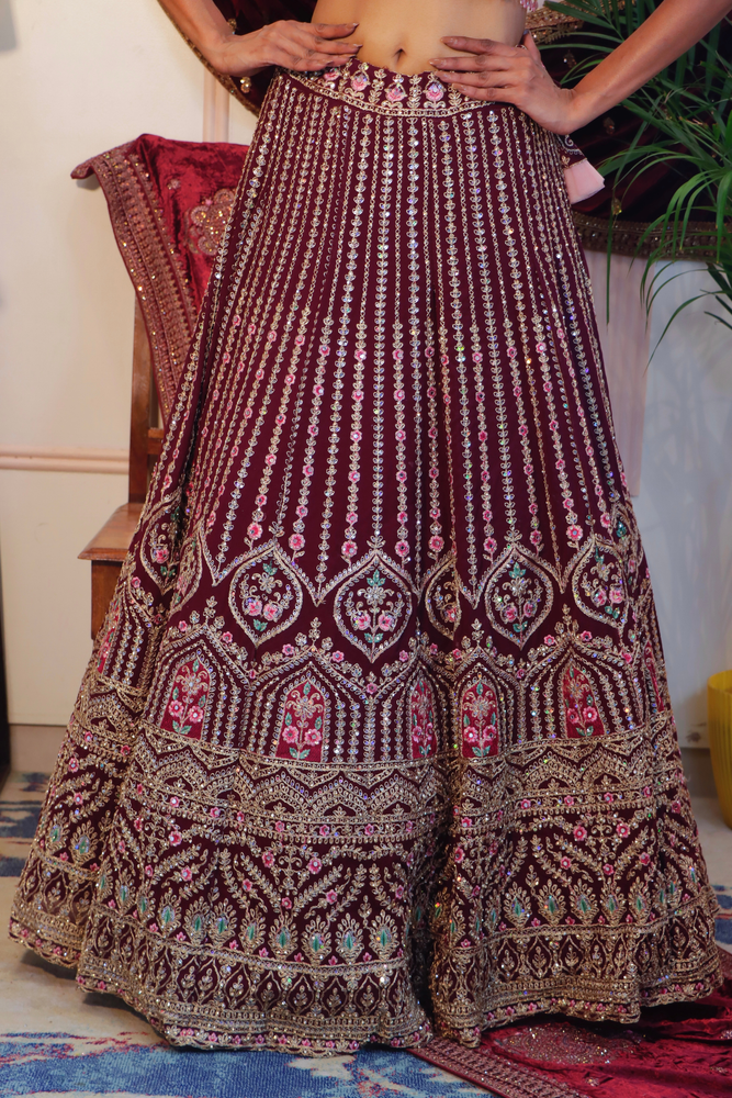 Step into the spotlight with this stunning wine-colored crop top lehenga, crafted in luxurious georgette silk for a flowy, graceful silhouette. The ensemble showcases intricate all-over Zari, thread, and sequin work, giving it a rich, regal finish that’s perfect for festive occasions, weddings, and evening events.
