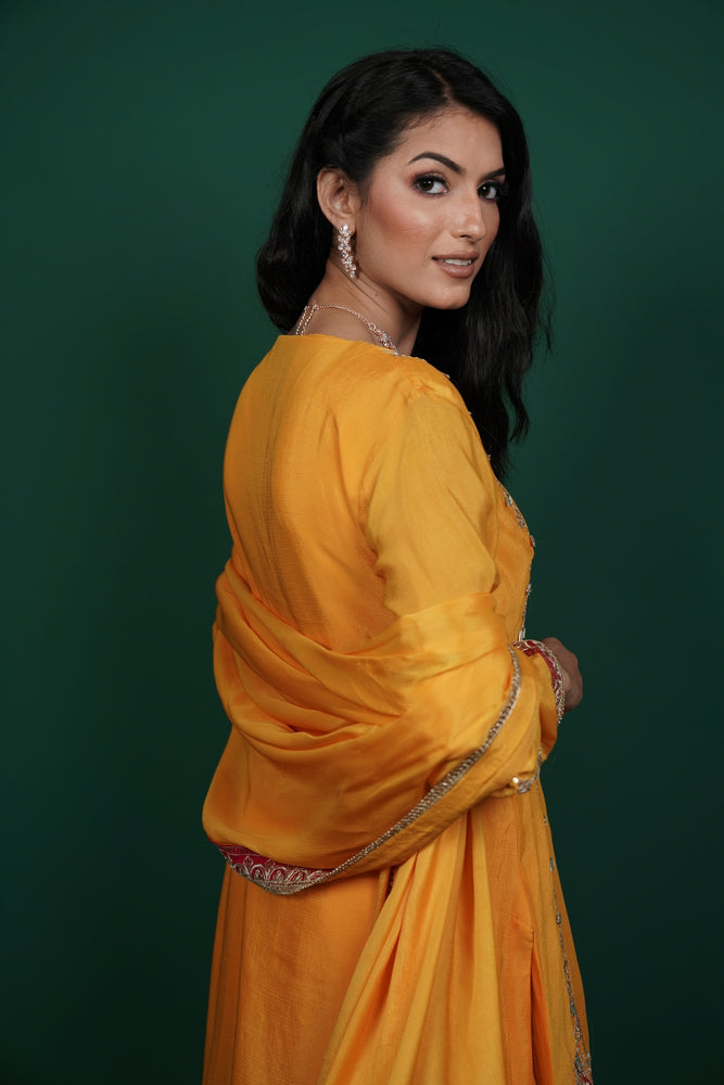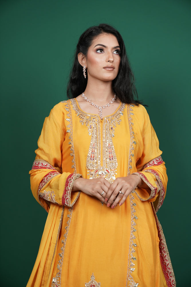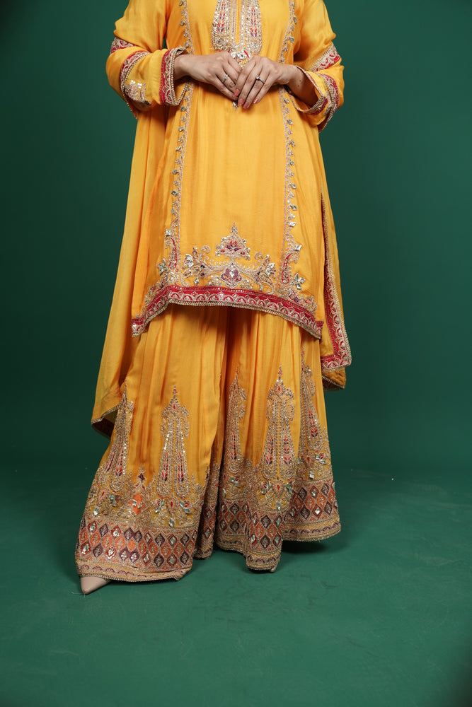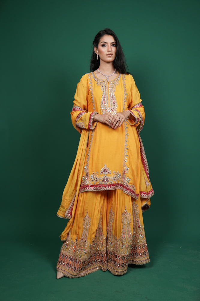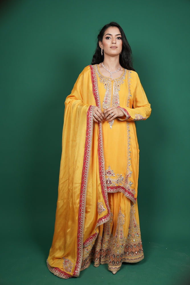 Radiate festive elegance with our stunning Kurti with Sharara & Dupatta set in a vibrant yellow hue. Crafted from luxurious Chiffon Silk fabric, this ensemble is a true celebration of intricate craftsmanship and royal charm.