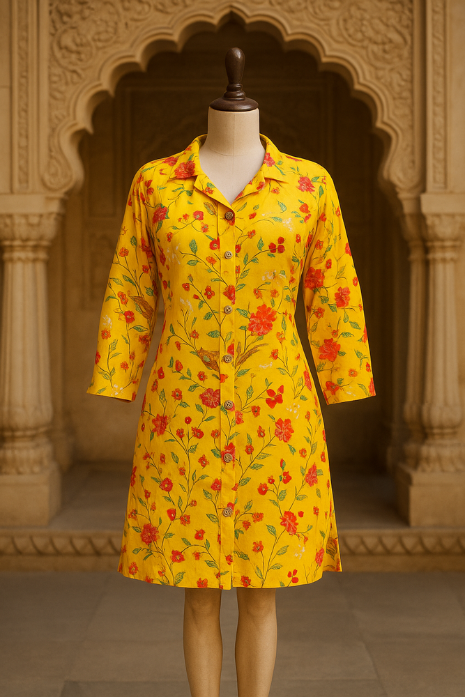 Brighten up your day with our Yellow Cotton Midi Dress, adorned with an all-over floral print that exudes freshness and charm. Made from premium cotton fabric, this dress ensures ultimate comfort and breathability, keeping you cool and stylish all day long. The midi length and flowy silhouette make it perfect for casual outings, brunch dates, or summer getaways. Pair it with your favorite sandals or wedges for a vibrant, effortless look.