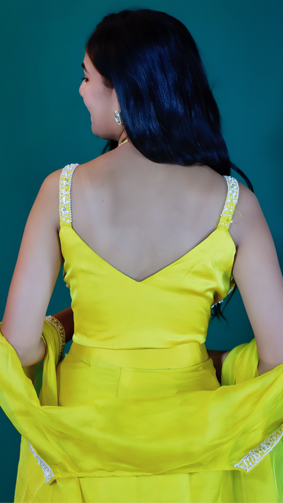 Step into elegance with this Yellow Satin Silk Dhoti Style Dress paired with a stylish shrug. Crafted from luxurious satin silk, the ensemble drapes beautifully, offering a perfect blend of comfort and sophistication. Adorned with intricate pearl and bead work, this outfit exudes subtle glamour, making it ideal for festive occasions, weddings, or special celebrations. The dhoti-style silhouette adds a contemporary twist to traditional fashion, while the coordinating shrug enhances the overall charm, completing a look that is both graceful and modern.